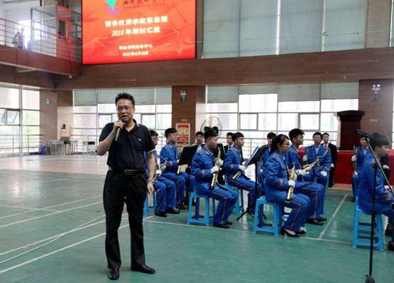 在学院电声乐团和学生古筝表演助兴演出后,军乐团强训汇报正式拉开帷幕。学院军乐团指导胡勇老师为广大师生介绍了军乐团组建、训练的基本情况。胡老师为大家介绍了在各系的支持下,学院军乐团4月初恢复组建训练,聘请专业教师自5月21日开始首次授课,至6月13日,共授课9次,团员由乐理知识零基础到能够流畅演奏出两首曲目的过程。军乐团主席刘康睿同学组织乐团各声部团员介绍本声部在军乐团中的作用。军乐团的首秀赢得了在场师生的阵阵掌声。