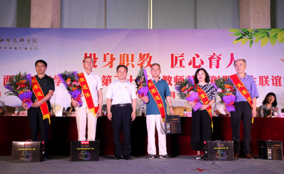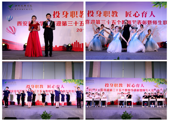庆祝活动分为优秀教师表彰会和师生联谊会两个环节。表彰会由西安技师学院党委副书记、纪委书记罗文科主持。技师学院院长冯柱致欢迎辞,他代表学院向全体教职工表示节日的问候和祝福,向一直关心学院发展的各级领导和各界人士表示衷心的感谢;技师学院副院长冯小平宣读了表彰决定,对在学院发展中表现突出、成绩优异的12名教师予以表彰;井海滨副厅长为获奖教师颁发奖品与鲜花;丁小林副总经理为2019年退休的5名教师代表颁发纪念品与鲜花;机电技术系教师马凤凤代表优秀教师作了发言,朴实的语言、真挚的感情展现了技师学院教师“言传身教,衣带渐宽终不悔;鞠躬尽瘁,一腔热血洒杏坛”的热情与追求;22G电维1班学生邱云帆代表全体学生发言,向老师们送上节日的祝福。
