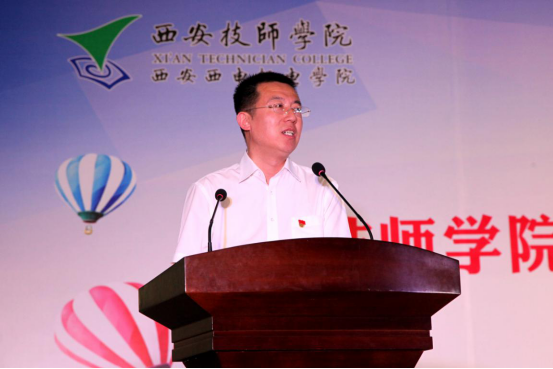省人社厅副厅长井海滨发表讲话。他代表陕西省人社厅对长期以来为技工教育事业奋斗的广大教职工表示问候和感谢;对西安技师学院在陕西省技工教育发展中取得的成绩和做出的贡献予以肯定;对全省技工院校教师提出三点希望:第一,坚守初心,做勇担使命的合格教师;第二,坚守师德,做立德树人的灵魂工程师;第三,坚守本分,做潜心务教的优秀教书匠。