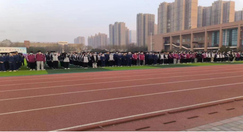 伴随着激昂雄壮的《义勇军进行曲》,五星红旗在校园中冉冉升起,在晨光中迎风飘扬。全体师生行注目礼,表达这对祖国的崇高敬意。