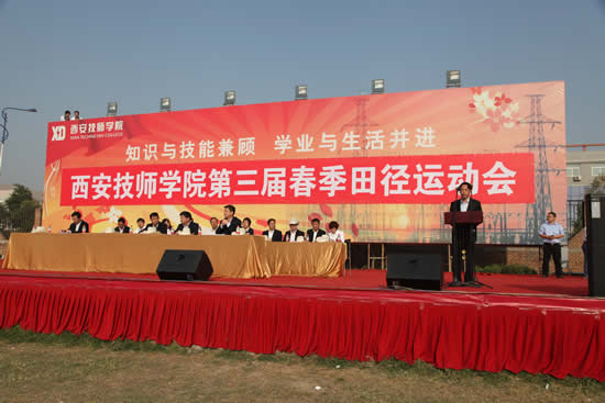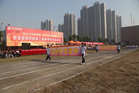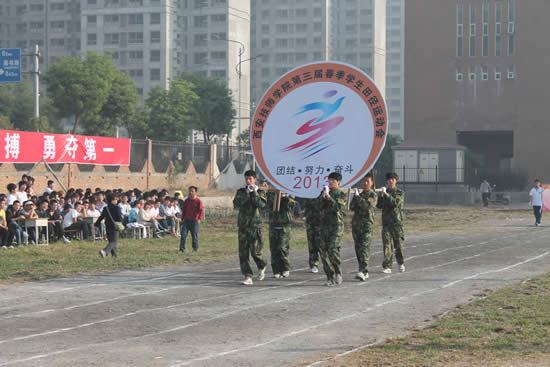 4月27日上午,春风和煦,伴随着嘹亮的运动员进行曲,西安技师学院第三届春季田径运动会在咸阳校区拉开了帷幕。运动会开幕式上,各系组成的表演方阵和运动员方队精神焕发、朝气蓬勃、口号响亮、信心百倍,踏着整齐有力的步伐走过主席台。国旗队、校旗队、彩旗队、军乐团的同学们意气风发,精神饱满地出现在大家面前。各系的方阵表演充分体现出学院学生的创新、青春和活力,他们的表演赢得了阵阵掌声,为运动会开幕式增添了亮点。