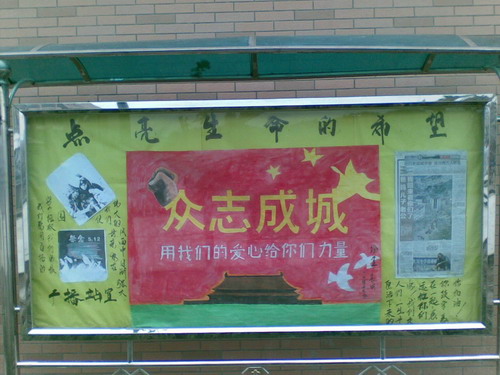 5月8日至12日,校区悬挂“心系汶川祝福汶川”签名横幅,寄托哀思,并以板报、广播的形式宣传地震知识和急救处理常识;