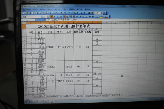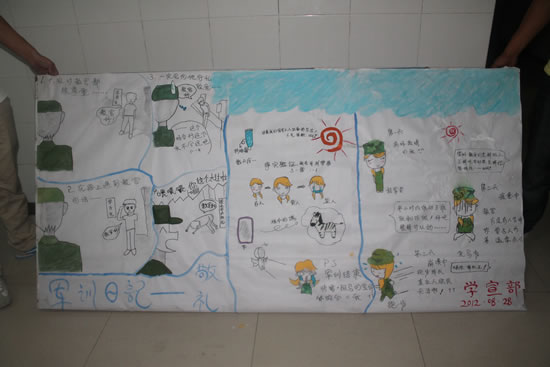 即便如此,仍有不如人意的地方:天公不愿作美,两场暴雨将国旗下的营连评比专栏洗刷干净,和教官协商后,按其要求重新制作。为了融合90后新生的审美情绪,宣传栏在设计之初就以漫画作为主体,拒绝死板,贴近学生。同学们对军训感想和日志的关注度很高,每天我们都对各系室报送的稿件进行审稿和统计,为优秀学员和先进集体的评比提供数据,也为同学们创建一个展示自我的平台。