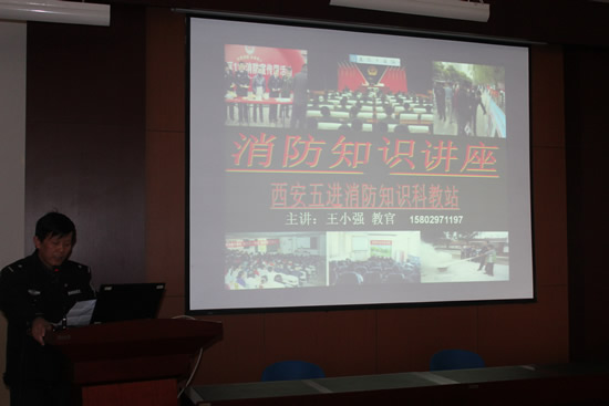 本次讲座特邀西安五进消防知识科教站王小强教官进行消防安全知识培训。参加培训会的有校区教职员工和学生代表140余人。