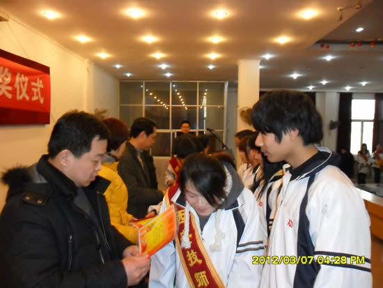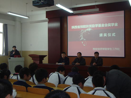 2011年3月7日,学生工作处于两校区同时进行了“陕西省技能扶贫助学基金会奖学金”颁奖仪式,旨在激励我院品学兼优、家庭贫困的学生顺利完成学业,培养其自强自立、勤奋学习、积极上进的良好职业道德素质,为其他同学树立榜样。学院党委副书记陆健安、副院长袁建章、机械工程系主任田玉芳、计算机系主任梁栋、学生工作处处长张民、副处长李智、杨坤及各系学生主管出席了此次颁奖仪式。