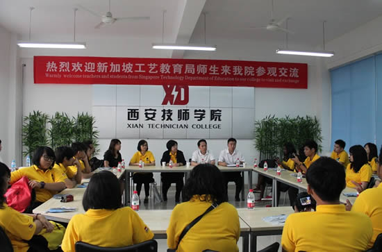 会议伊始,学院党委副书记、副院长陆健安对新加坡来访师生表示了热烈欢迎,学生工作处副处长杨坤介绍了古都西安的厚重历史和我院优秀的办学成果,并一一介绍了今天参加活动的10名优秀学生。新加坡工艺教育西部学院潘老师对我院的精心安排和热情接待表示感谢,并真诚的邀请我院师生去新加坡、去工艺教育西部学院参观交流。接着同学们按照相近的专业进行了友好的交流互动,他们好奇我们的学习生活方式、询问我们从小到大的学制、了解陕西文化和我院文化的特色,由于来访的20名学生中有一部门学生精通英汉双语,所以沟通进行的无比顺畅,开始还有些拘谨的我们,慢慢的敞开了自己,畅所欲言。遗憾的是交流的时间总是过的那么快,依依惜别时,同学们彼此互留E-mail并在E座电子屏前合影留念。之后,在专业讲解人员的带领下,大家从E座到D座,参观了我院教学实习场所,并演示了预备技师班学生的教学成果,获得他们的声声赞叹,频频拍照留念。