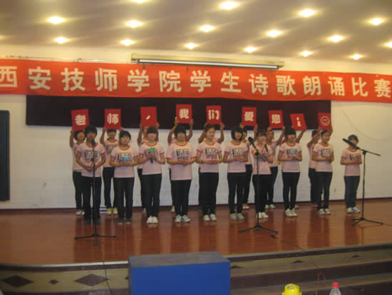 此次比赛从初赛到决赛,历时一个多月,参与的选手众多,经过初赛和复赛,走进决赛的共计19个参赛队。朗诵的诗歌内容丰富,有现当代名家的诗词,如徐志摩的《再别康桥》(中、英文版),同学们娓娓道来,将我们带入新月派诗歌美妙的意境中,感受诗人对往昔生活的憧憬,对眼前离愁淡淡忧伤;有歌颂祖国的诗句——王怀让的《我骄傲,我是中国人》;有催人奋进的《中华少年》,抑扬顿挫,充满激情;有饱含深情的《感恩父母》;也有朗诵者自作的诗歌《西安技师学院,梦想的殿堂》,咏诵出了我院师生的自豪感,朝气蓬勃。