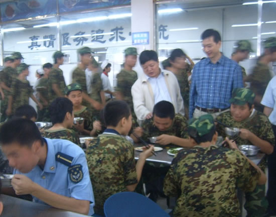 午餐时刻,李院长与贺副院长来到餐厅一层,亲切慰问正在就餐的新生,关心的询问餐厅饭菜是否合口。在充分肯定参训学生取得的成果和良好表现外,希望他们再接再厉,圆满完成军训任务,以优异的成绩向领导汇报。