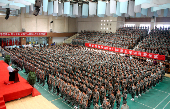 为加强新生爱国、爱党、爱校教育,坚定理想信念,树立国防观念,增强社会责任感,2019年8月22日,西安技师2019年军训开营仪式在学院文体活动中心举行。院长冯柱,学院党委副书记、纪委书记罗文科,副院长冯小平,军训团领导及全体官兵,各部门负责人、学管、新生班主任以及2019年全体新生参加了开营仪式。开营仪式由副院长冯小平主持。