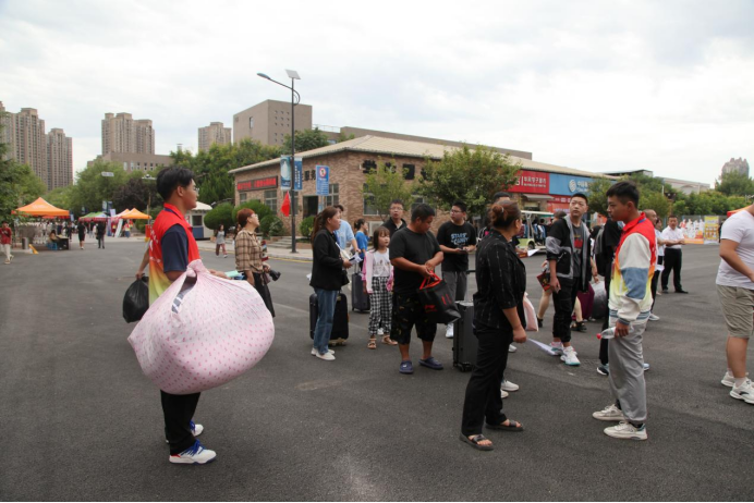 从学院大门到学生公寓楼,志愿者服务队热情帮助学子搬运行李,指引道路……