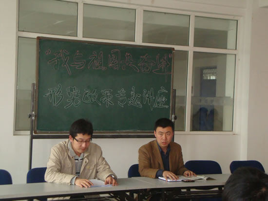 学院团委书记杨坤结合当前社会形势和我院学生特点,充分讲述了自建国以来社会的发展,就“如何与祖国共成长”杨坤老师列举了“龟兔赛跑”的寓言故事及当代大学生幸福生活的实例,并对“十二五”规划的美好前景进行展望。