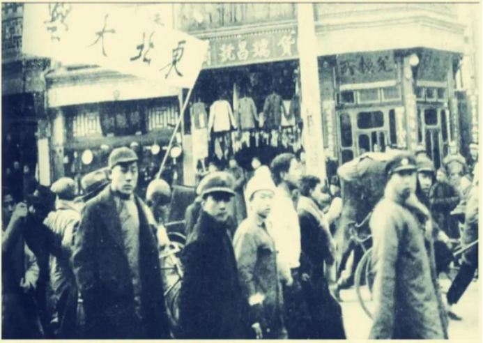 图为北平大中学生数千人冲上街头,举行声势浩大的游行示威