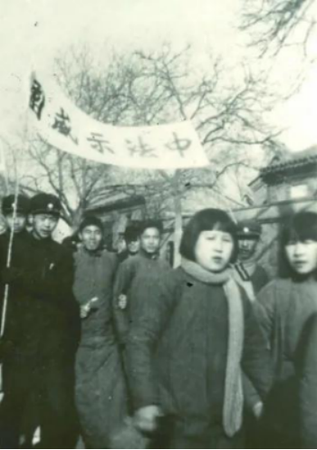 图为清华大学女学生陆璀(持话筒者)在北平西直门外进行抗日宣传