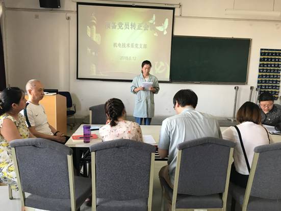2018年6月12日,西安技师学院机电技术系党支部组织全体党员在E-302召开了关于张璇同志由预备党员转正的支部大会。机电技术系党支部组织委员马凤凤同志组织并主持了此次会议。