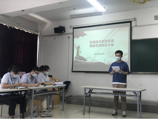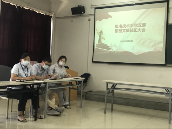 机电技术系党支部书记高德龙同志代表支部宣读全体党员大会讨论决定,同意推荐徐沛同志、刘文玲同志如期转为正式党员。他希望两位同志在今后能继续加强政治理论学习,提高政治站位,工作中能够始终坚持以党员的标准严格要求自己,主动承担重任,为支部、系部和学院做出新的贡献。张琳娜同志也对两位同志提出要求和希望,勉励他们要求实务实,鼓足干劲,积极发挥年轻党员的先进模范作用,在工作中再创佳绩。