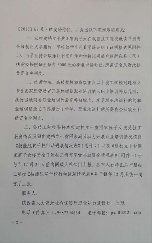 为贯彻落实好《陕西省人力资源和社会保障厅、陕西省扶贫办转发人力资源社会保障部、国务院扶贫办关于开展技能脱贫千校行动的通知》这项行动,特对在我院就读的农村建档立卡贫困家庭子女,资助如下: