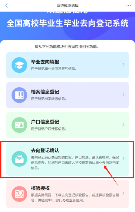 1、关注绑定“国家大学生就业服务平台”公众号,点击“去向登记”直接登录,进入“去向登记确认”。