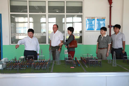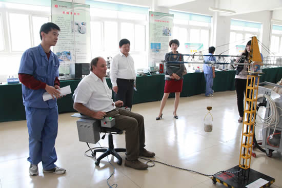 随后,杰克·杜塞尔多普一行在李长江院长的陪同下,参观了高压电气系、工业自动化系、汽车工程教研室的课堂教学与实训中心,以及校办工厂豪特公司生产车间和我院现代化的大型学生餐厅。在高电系实习教室,都塞尔多普主席和正值担任13G输变电高电2班安全员的高阳阳、高晓燕同学的交流中,杜塞尔多普主席问到“你为什么选择这所学校?之前有没有来过这所学校?你了解你的专业吗?”两位同学在回答中对专业的了解和对职业的热爱使杜塞尔多普主席对我院学生刮目相看、连连称赞。当杜塞尔多普主席参观到我院预备技师班的作品展室时,饶有兴趣的亲自操作了我院学生自己研制的塔式起重机模型,并给予高度评价。