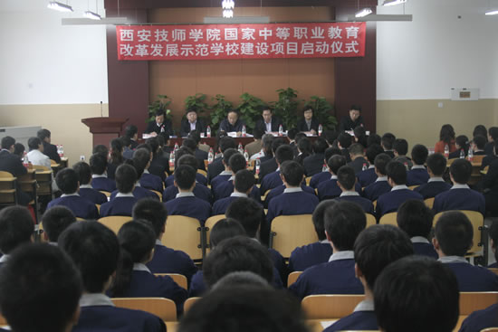 10月12日,西安技师学院隆重举行国家中等职业教育改革发展示范学校建设项目启动仪式,西安市人力资源和社会保障局副局长杨庆、陕西省人力资源和社会保障厅职业能力建设处副处长李西安、西安市人力资源和社会保障局就业建设处副处长张妙玲、中国西电集团公司人力资源部副部长赵辉、西安技师学院领导出席仪式,电气技术、机械加工专业指导委员会成员、合作企业代表和部分学院师生参加了大会。