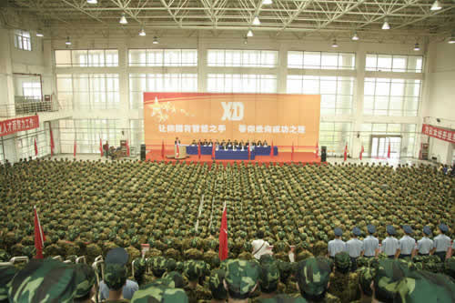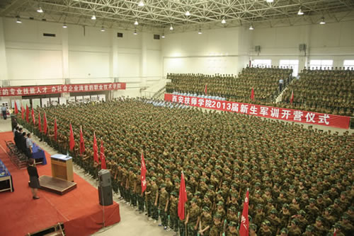 2010年8月24日上午,在庄严的国歌声中,我院2013届新生军训开营仪式在位于咸阳新校区文体餐饮中心隆重举行,全体新生参加了军训开营仪式。出席此次开营式的领导有副院长王德意、副院长贺惠民、党委副书记纪委书记袁建章、空军工程大学学员六队队长徐维军、空军工程大学学员六队教导员杜建强,学院各部门负责人都参加了开营式。仪式由学生工作处处长张民主持。