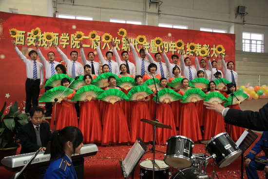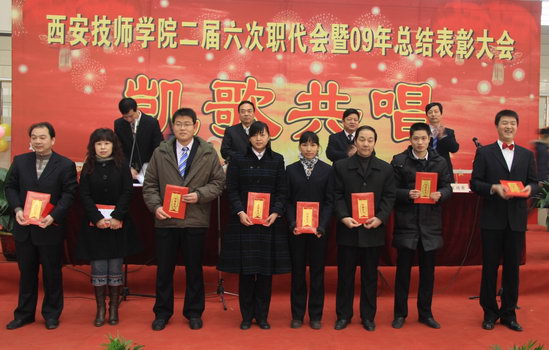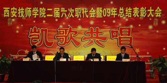 2010年1月15日,咸阳校区文体餐饮中心内鲜花锦簇、彩球缤纷,一派喜庆、热烈的气氛,我院二届六次职代会暨2009年总结表彰大会在此隆重召开。学院领导院长李长江、党委副书记工会主席袁建章、副院长王德意、副院长贺惠民、正式代表49名、列席代表5人及全体教职工出席会议。