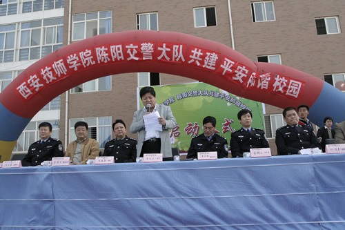 李长江院长在启动仪式上致辞,他指出,学院要以此次警民共建平安和谐校园启动仪式为契机,把校园安全、财产安全、师生人身安全作为一项重要工作来抓,牢固树立安全意识,为社会培养高技能人才,推动地区经济建设和社会发展不懈努力。陈阳交警大队孙维弟教导员做了交通安全报告,他号召全体师生都要认真学习交通安全知识,树立现代公民交通文明意识。学院学生代表做了“珍爱生命,遵守交通规则”的发言。咸阳市交警支队副支队长贾必胜作了重要讲话,他再次强调了交通安全进校园的重要性,希望通过此次警民共建平安和谐校园,促进交通安全进学校系列活动的开展。