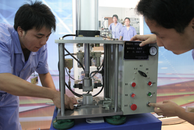 学院预备技师班毕业生正在调试自己设计制作的四柱式气动液压机