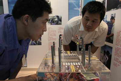 学院预备技师班毕业生正在调试自己设计制作的交通灯控制模型