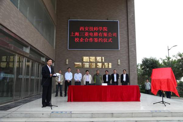 签约仪式上,上海三菱电梯有限公司西北大区总经理陆雄国先生和院长李长江代表双方签署校企合作协议。上海三菱电梯有限公司陕西分公司陆雄国先生介绍了上海三菱电梯有限公司的发展状况,他指出,学院作为长期与上海三菱电梯有限公司保持稳定用工关系的高技能人才输送基地,近年来,为上海三菱电梯有限公司输送了大量的与优秀毕业生,毕业生去企业后,很快能胜任工作。此次的校企合作将进一步强化双方合作,优势互补、资源共享、互惠双赢、共同发展。李长江院长代表学院向来宾至欢迎词,并介绍了本次校企合作对学院及企业的发展的重大意义。本次合作采用“上海三菱电梯班”订单式的培养模式;学院为三菱电梯提供面向销售、售后维护保养团队的培训服务;学院教师定期到三菱公司进修学习、学生按期到三菱公司实习、就业;此次活动是学院推进课程改革的重要前提,是学院实现“双师型”教师队伍建设的有效举措,是解决企业人力资源的有效手段,也是促进企业技术进步和提供的高技能人才培训服务的重要途径。