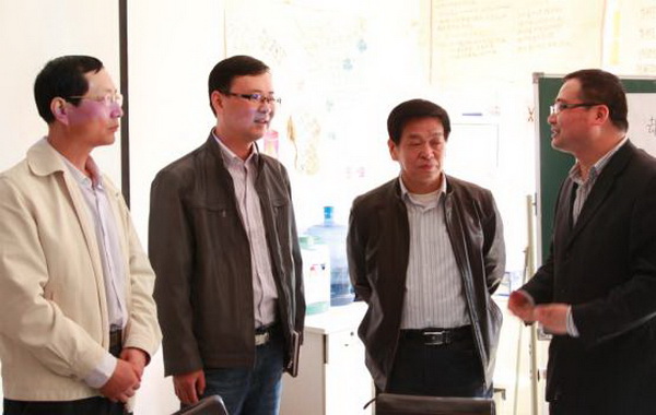 省技工指导中心副主任张镭(左三)、 副主任武争鹏(左二)、学院副院长王德意(左一)与袁红旗老师(右一)亲切交流