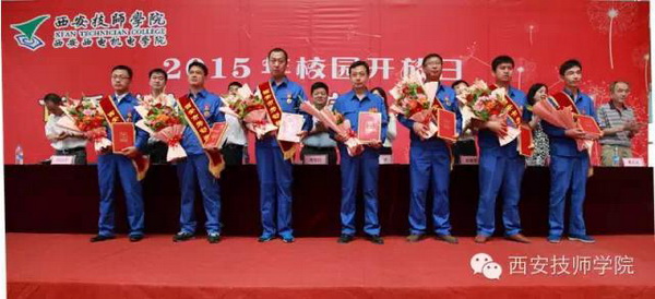 5月23日上午,在学院召开的“优秀学生表彰暨院长家长沟通会”上,学院向获得全国和西安市劳动模范称号的高喜喜、杨兵、杨京生、胡步洲、曾国荣、温柱柱、杨乐、焦刚8名我校优秀毕业生颁发西安技师学院德技辅导员聘书并对他们为母校争光献花表示感谢。