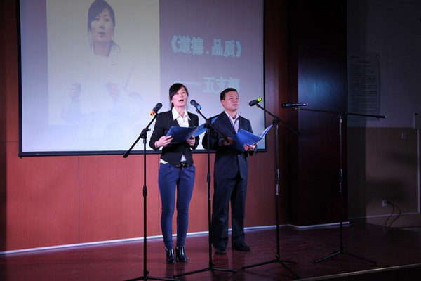 道德讲堂活动以“提升品德素养、汇聚道德力量”为主题,分七个环节进行。分别是静思、唱一首歌、诵一段经典、节目表演、内心说一句感言、送吉祥、做点评。整个活动通过创新,以视频播放主持贯穿活动始终,环环相扣,气氛和谐、温馨。活动在背景音乐下,让大家静下心,跟唱《爱的奉献》;诵读《道德经》部分内容,感悟了人性的真善美;八个支部围绕着道德与品质这个主题,通过演讲、诗歌朗诵、情景剧、讲故事等多种形式,讲述了身边和学院内发生的感人故事,激励大家弘扬正能量,努力做道德的实践者、传播者和受益者。活动中,还为大家送上印有社会主义核心价值观的卡片,老师们很受感动,部分教工现场发表了自己的体会和感受,并表示要发挥自己爱岗敬业的职业道德,从自己做起。学院纪委书记、工会主席袁建章出席活动并做总结讲话,他希望全体教工继承和发扬古圣先贤的智慧和思想,厚德善行、勇担责任,从现在做起,率先带头践行,感染和教育学生,为培养有素质有教养的高技能人才做出我们应有的贡献。