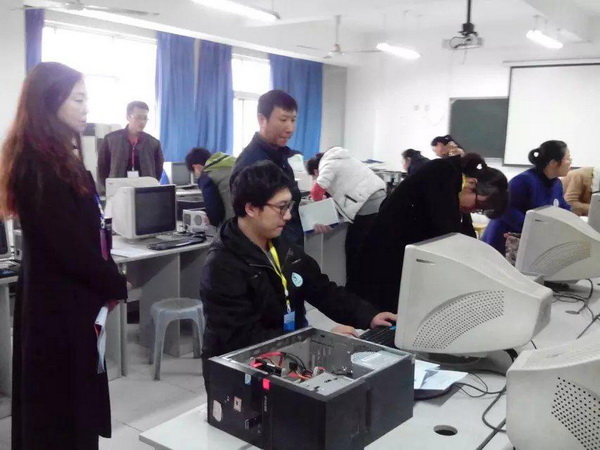 图为丁明景老师在比赛中进行计算机组装