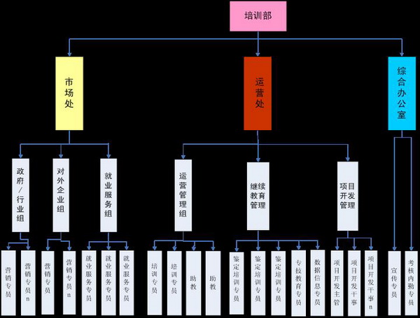 此次调整工作包括对培训部原有项目一部、项目二部、项目三部、项目开发部、鉴定站、管理办公室经整合调整为:市场处、运营处、综合办公室。调整后的市场处主要负责培训销售工作;运营处负责承办培训工作;综合办公室负责培训部全部门考核、宣传,及为其他部门提供培训服务保障。