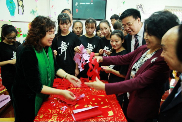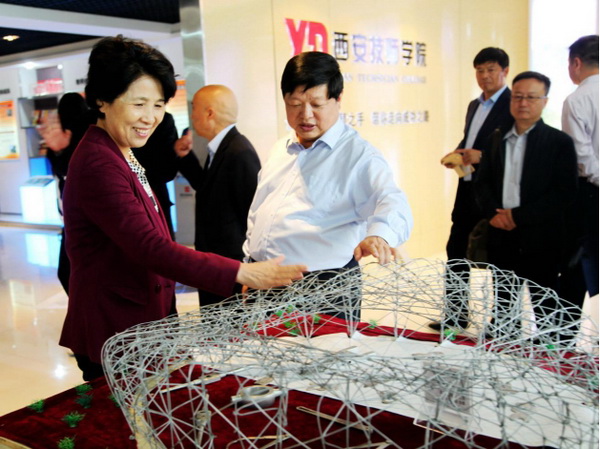 陕西省政协副主席、陕西省中华职业教育社主任李冬玉在观看学生作品