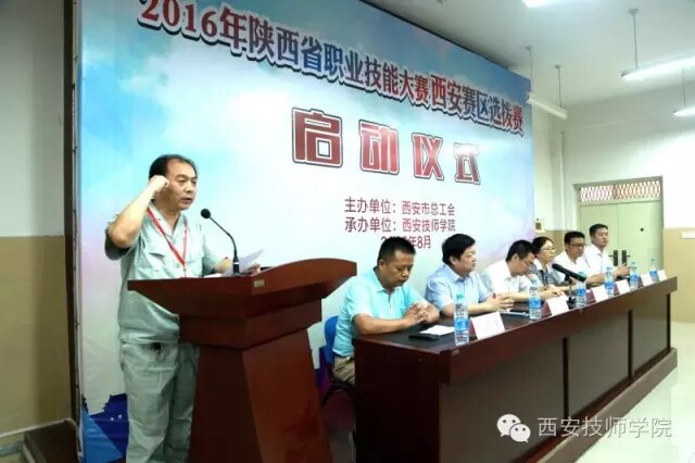 他充分肯定西安技师学院在职业教育领域耕耘60余年,在西北地区高技能人才培养上取得的成绩,对此次选拔赛给予的支持表示感谢。最后他希望大赛严密组织、公正评判,每位选手取得优异成绩。参赛选手代表——中国西电集团公司参赛选手代表刘文龙,裁判员代表——西安技师学院侯旭峰分别进行了庄严地宣誓。