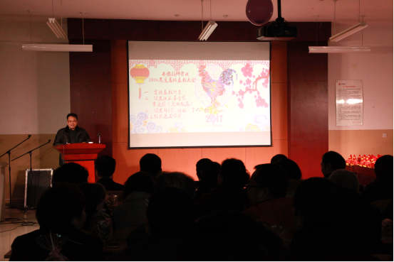 李长江院长做新年致辞,并带领领导班子成员向全体教职工拜年。他向2016年度在工作岗位上辛勤工作的教职工表示衷心感谢,希望受表彰的集体和个人再接再厉,为学院发展做出新的贡献;同时,他强调2017年是学院发展的关键之年,他号召全体教职工在新的一年里,脚踏实地,“撸起袖子加油干”,为打造服务西电、面向社会,将学院建设成为具有国际视野、国内著名、特色鲜明的企业大学目标而努力奋斗。