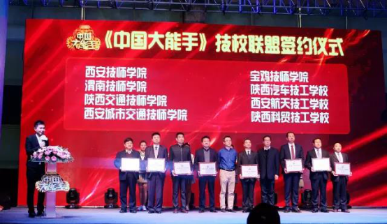 中央电视台中国大能手栏目总策划尚震和省人社厅职业能力建设处处长李西安为西安技师学院等陕西省8家签约联盟技工院校授牌。随后,国家人社部技校管理处处长翟涛、央视大能手栏目组总策划尚震、省人社厅副厅长史新喜、市人社局副局长冯莉、西安技师学院院长李长江上台点亮手印,共同启动《中国大能手》第三季。