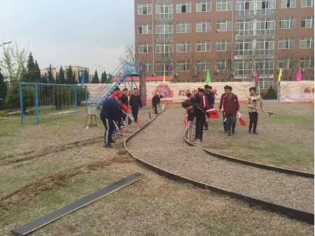 学生志愿者在老师的带领下为遥控车赛场跑道插旗