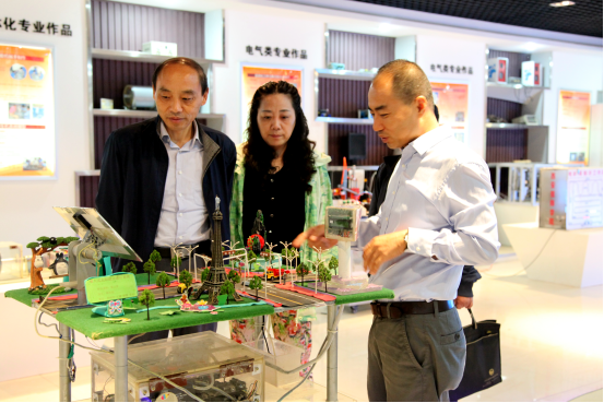 冯小平副院长(右一)带领来访人员参观学生作品创意室