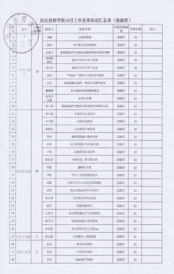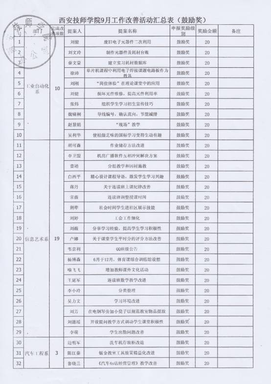 经过个人申报,部门及精益推进办审核后,11月6日,院长李长江对本年度9、10月份的教工精益改善“鼓励奖”进行了审批,并特别指出,机电技术系(原工业自动化系)已从原来的增加改善数量转变为现在的提高改善提案质量,从“量”到“质”的改变本身就是大的改善,给予了很高的评价。现代服务系(原信息艺术系)提倡全员参与,系部的每一位老师都参与到精益改善当中。