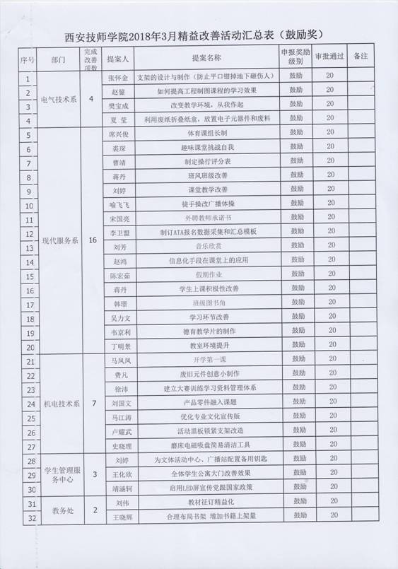 2018年3月,经过个人申报,部门及精益推进办审核后,学院共发出奖励58个,其中三等奖7个,鼓励奖51个。
