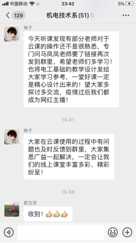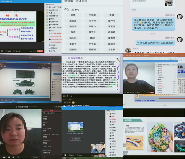 机电技术系,在系主任及教研室主任的统一领导下,各项线上教学准备工作有序开展。通过线上交流、视频会议等形式,各教研组、同课头老师积极交流、集体备课,同时组织网课教学经验丰富老师进行经验分享,系内、组内、专业老师们自主学习和相互切磋,研讨多种线上教学形式。遇到困难克服困难,没有条件就创造条件,一台电脑、一部手机、一个话筒,书房变身课堂和演播室,全体教师纷纷化身网络“最美主播”,通力合作、群策群力、众志成城,共同为即将开展的线上学习做好前期准备。