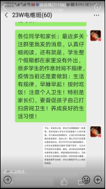 疫情爆发后,班主任老师们以班级微信群、QQ群为主要工具,了解关心每一名学生的动向和身体状况,及时传达上级通知,每天统计所有学生目前所在地、身体有无不良反应;摸清学生假期出行情况,提醒他们注意居家隔离、注意卫生。每天问,每天报,每天提醒。不落下一个学生,准时汇报班级情况。