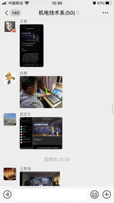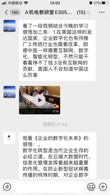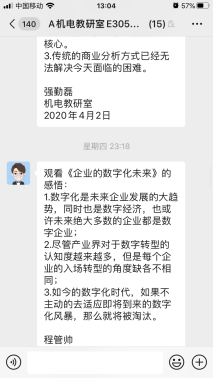 为贯彻习近平总书记在统筹推进新冠肺炎疫情防控和经济社会发展工作部署会议上的重要讲话精神,全面落实党中央、国务院决策部署,精准有序推动复工复产,全力以赴完成全年目标任务,加快企业数字化智能化转型,增强教职工打赢新冠肺炎疫情阻击战的信心和决心,4月2日晚上19.30,西安技师学院机电技术系组织全体教师通过钉钉APP载体,收看由国务院国资委教育培训中心和中国企业联合会共同举办以《企业的数字化未来》为主题的企业家高端对话网络直播活动,并就自身学习情况做好观看笔记和学习感想。