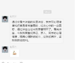 该系列课程由中国大学生在线、高校思政工作队伍培训研修中心、高校辅导员网络培训中心联合北京师范大学、南开大学、复旦大学、华中师范大学、西南交通大学、陕西师范大学心理中心共同推出。通过在线学习,学生们更加深刻的认识到学习心理健康知识、主动进行心理健康咨询与交流的重要性和必要性。观看结束后,部分师生在班级群开展线上交流,通过分享心得感悟表达自己对心理健康教育的认识。22WG发电厂班学生赵超杰表示:“通过收看大讲堂系列讲座,我发现心理健康知识真是非常重要,过去心中的一些困惑,通过讲座令我茅塞顿开。今后我要重视自己、家人、同学的心理健康,提高心理防御能力,让我们携手,坚持到防疫胜利。”