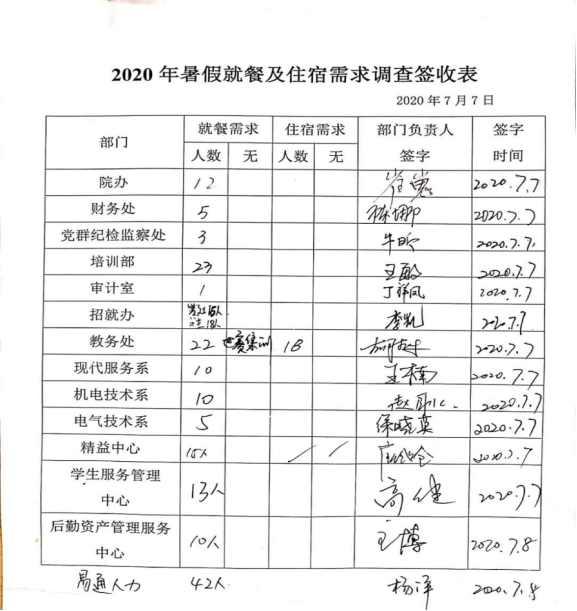 后勤资产管理服务中心一改往年发通知调查暑假期间就餐、住宿需求的做法,转变观念,改进工作方法,提高为学院教学、培训、招生和发展服务的水平和质量,食堂及公寓主管高常喜老师采取主动先行、上门服务的方法征求各部门的需求,听取意见。通过全方位的调查和意见听取,重点掌握了暑假期间技能大赛集训、培训、招生、值班、联合办学等项目的就餐、住宿、卫生保洁等服务保障需求,针对这些需求,结合学院实际,对暑假期间的疫情防控和就餐、住宿、卫生保洁等工作进行了统筹安排,同时就大家提出的意见和建议制定了优化措施。