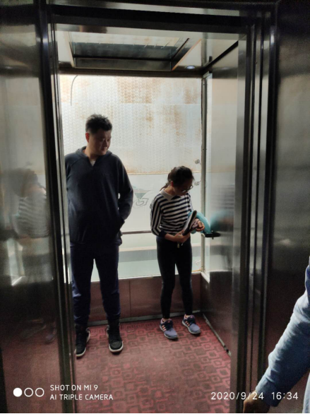 轿厢门打开,两位老师应急动作规范