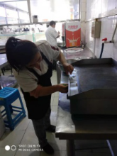 进了操作间,我们看到每一操作间里都有餐厅工作人员在忙碌地擦洗着工作台,案板、炒锅、烤箱等。学院负责餐厅管理工作的高常喜老师告诉我们,不论是哪家档口,如果达不到学院所要求的标准,是绝不允许开业的,因此各档口经营户都把自己操作间的厨具与工具的清洗、消毒工作作为重点,反复清洗、消毒,准备迎接学院最后的检查。