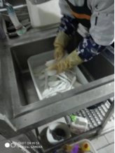 公共餐具是疾病传染的主要渠道,餐厅公共餐具的清洗消毒做的怎么样呢?带着疑问我们来到了餐具清洗间,对餐具清洗机各部分进行认真的检查,我们看到在最容易积累油垢的水槽与传送链上,这时已被清洗的干干净净,看不到一点油垢,在旁边的消毒柜里,一叠叠碗碟正在高温下消毒,消毒柜旁边的台案上,已经完成消毒工作的餐具还在散发着烫人的热气。在餐具清洗间墙壁上张贴的工作记录上,我们看到,碗筷的清洗、消毒的每道工序都有专人负责,分工明确,任务完成后必须经专人检查、签字确认后才能够使用;特别值得一提的是,学院的清真档口所使用的餐具都是由档口的从业人员自己单独清理与消毒,从而做到了与其它档口的餐具严格区分开来。看到防止病从口入这一关把守的不错,我们又把目光投向了食材,这时才发现,每个档口的操作间内的冷冻、冷藏柜里和货架上,都空空如也,什么都没有!经询问才知道,为了保证食材质量,在放寒假前,学院已要求所有的档口把剩余的食材与调味品全部清理掉,不允许有任何遗留食材存在,在本学期开学前两天才允许购买的新食材、调味品进操作间,看到这一切,我们不能不为学负责学院餐厅管理工作的老师们的良苦用心与辛勤劳动点赞!